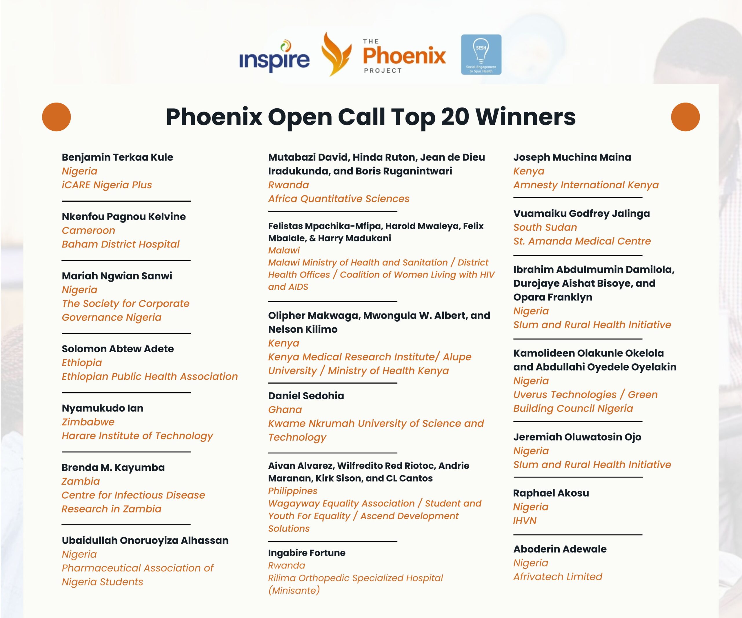 We are deeply grateful to the Phoenix Open Call steering committee, organizing team, judges, and our partner organizations—INSPIRE, SESH, LIGHT, AVAC, 4Youth By Youth, NIMR, and PATC³H-IN, whose collective effort made this initiative possible.